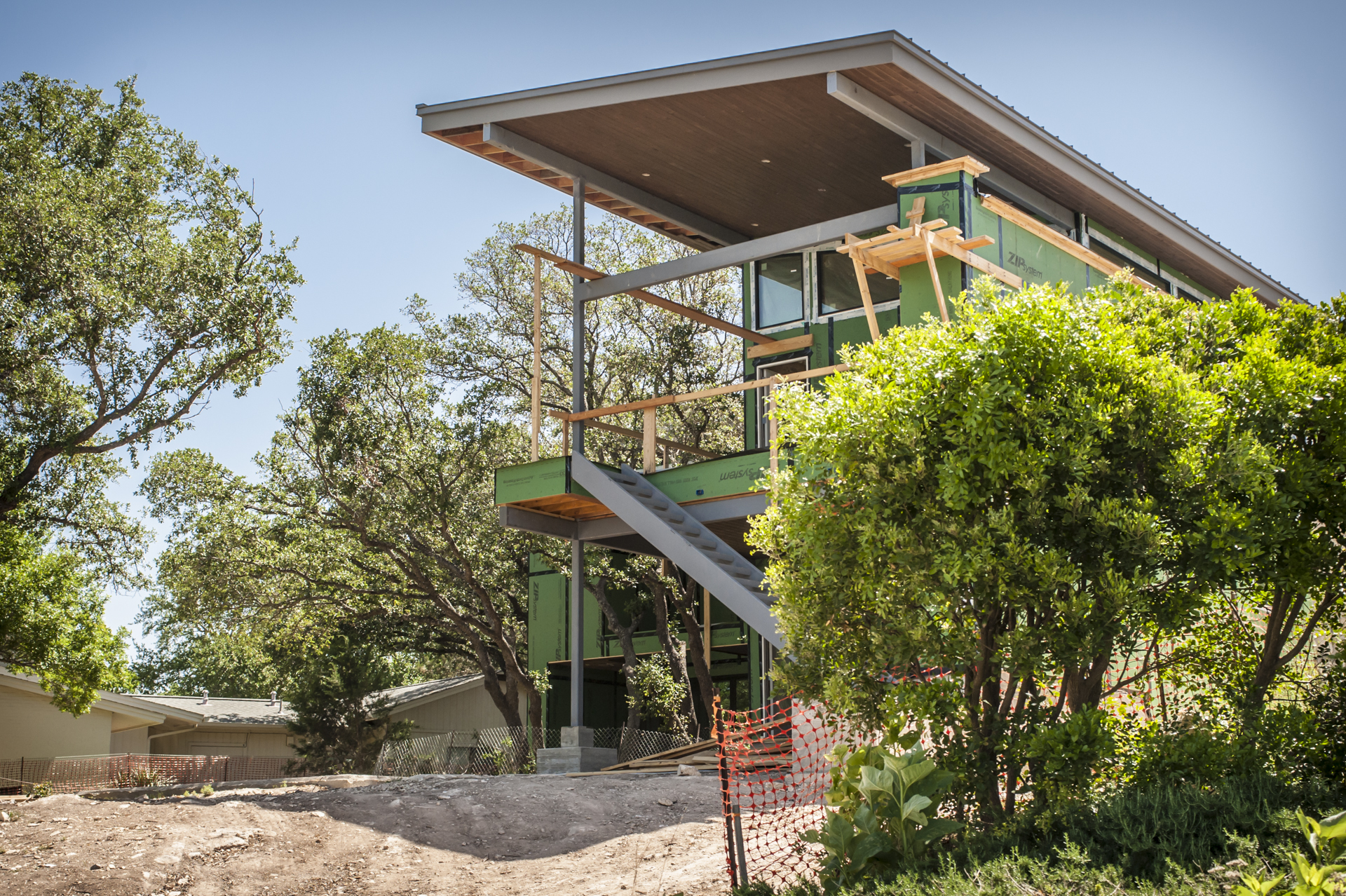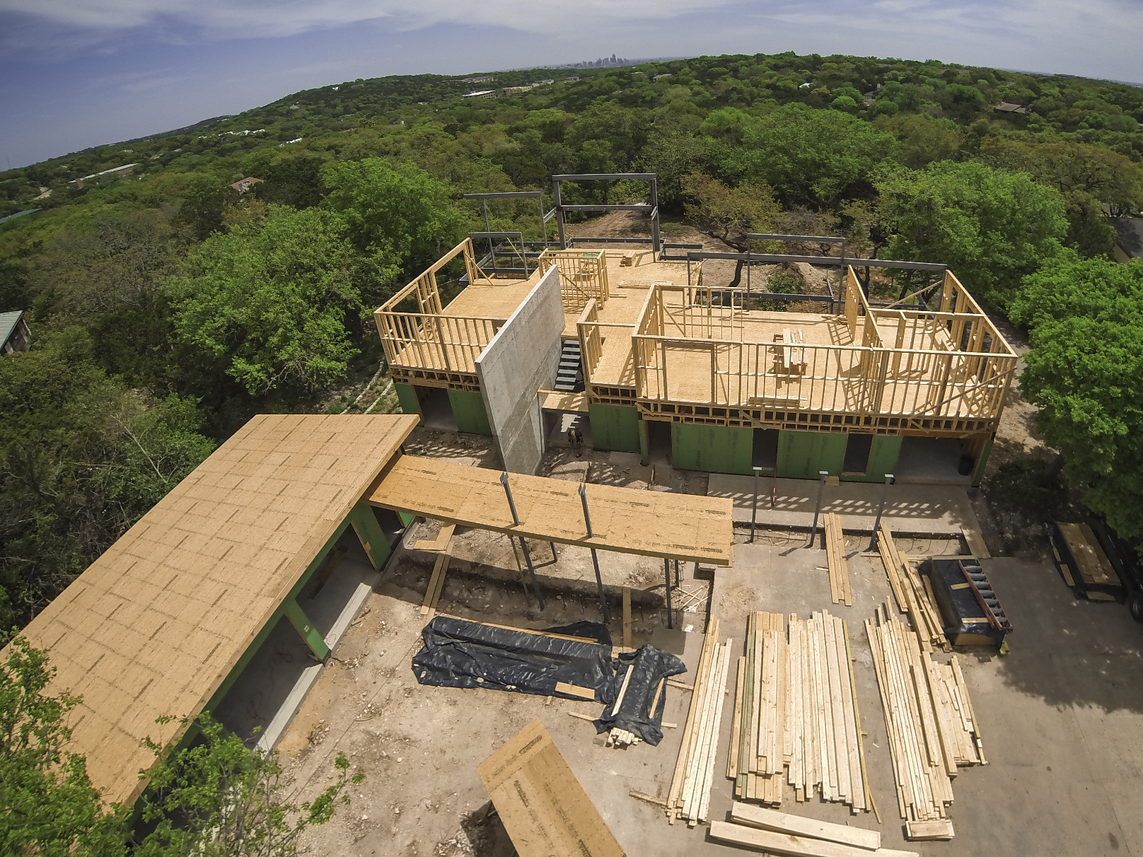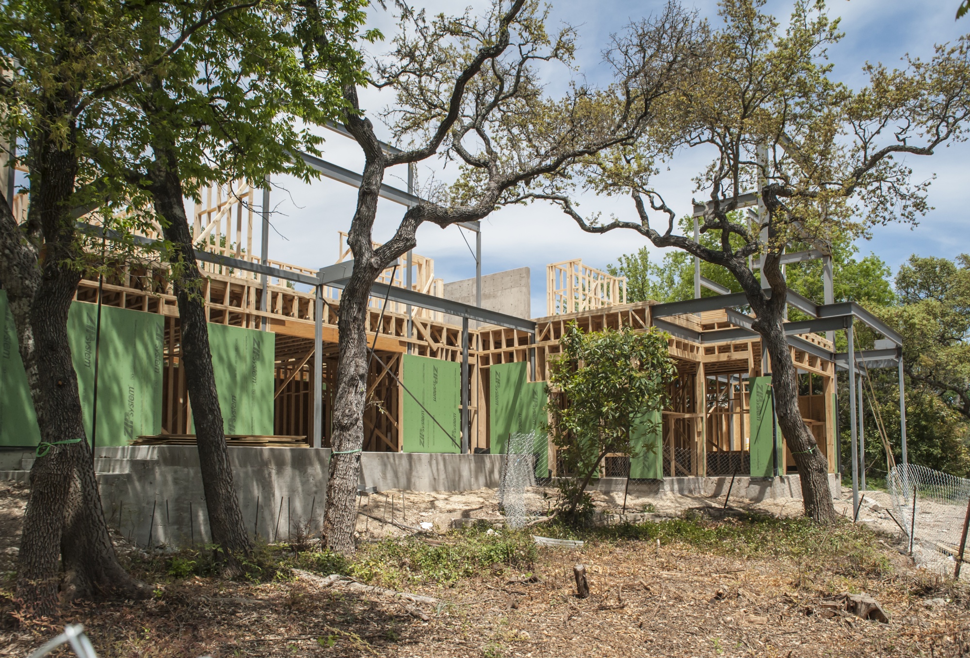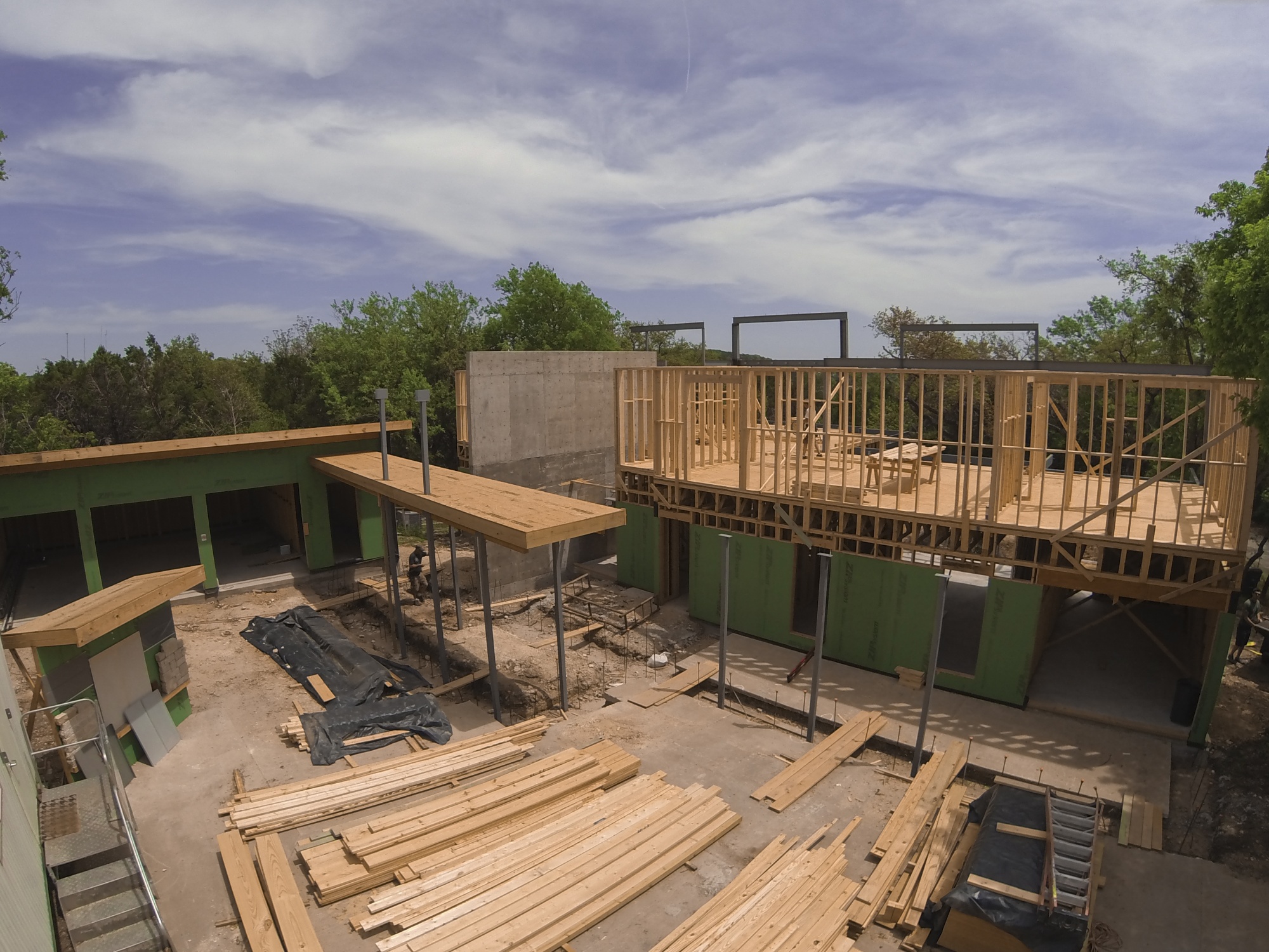 Our Sr. Project Manager, and 2014 Construction Manager of the Year, Matt Carswell is well on his way to making this new home a reality for our clients. This upside down house affords wonderful Lake Travis views from the second story living spaces, while also honoring the well established native oak trees on the property. It’s these trees and the positioning of the home which provide a sense of privacy even with floor to ceiling glass walls.