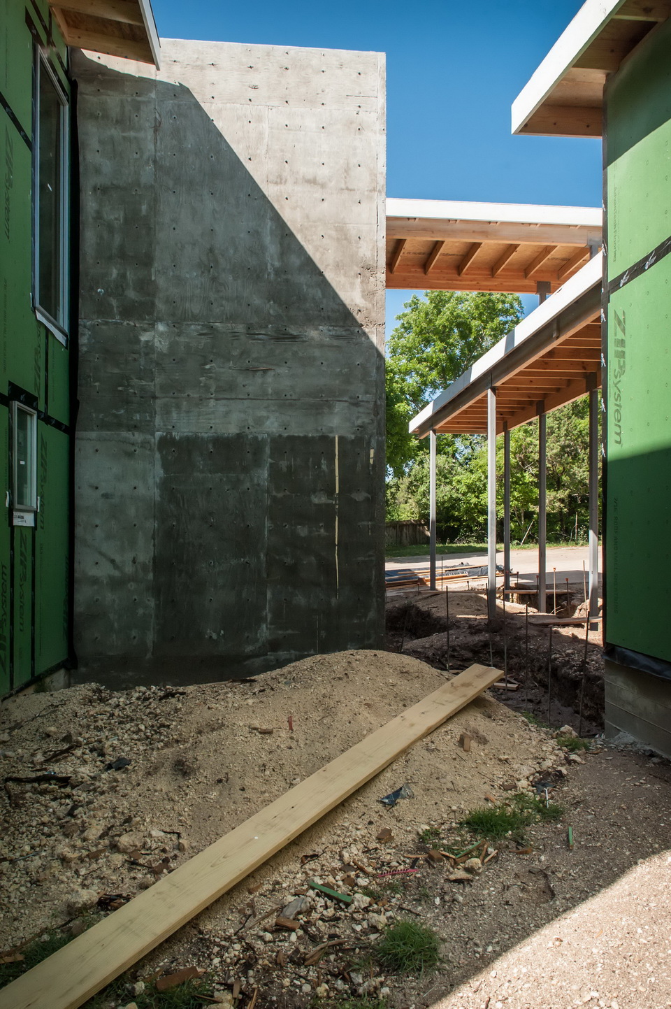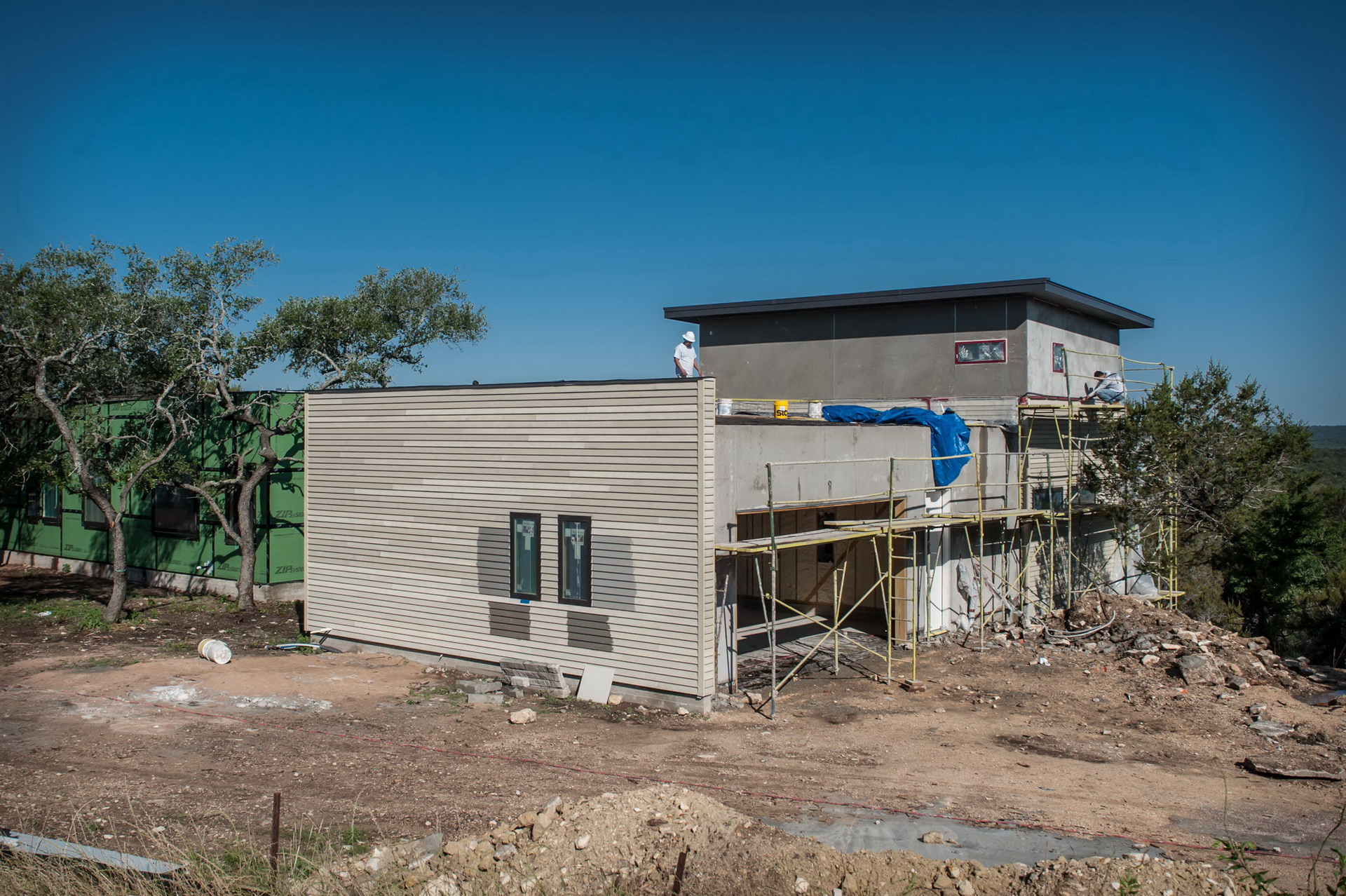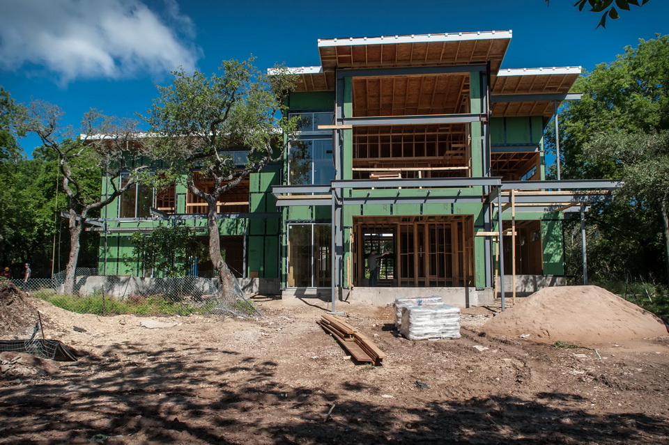Our Sr. Project Manager, and 2014 Construction Manager of the Year, Matt Carswell is well on his way to making this new home a reality for our clients. This upside down house affords wonderful Lake Travis views from the second story living spaces, while also honoring the well established native oak trees on the property. It’s these trees and the positioning of the home which provide a sense of privacy even with floor to ceiling glass walls.